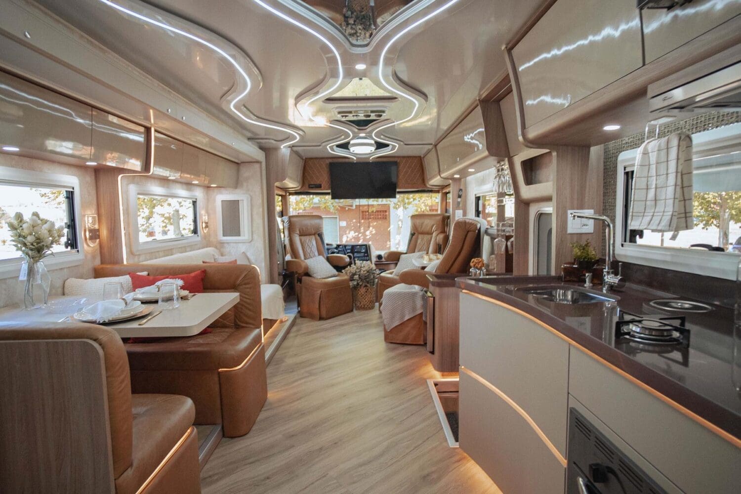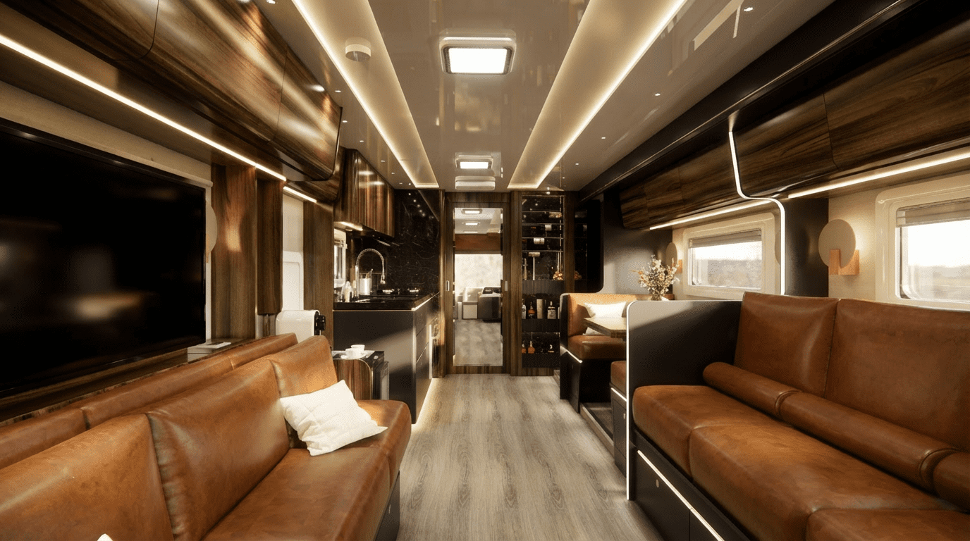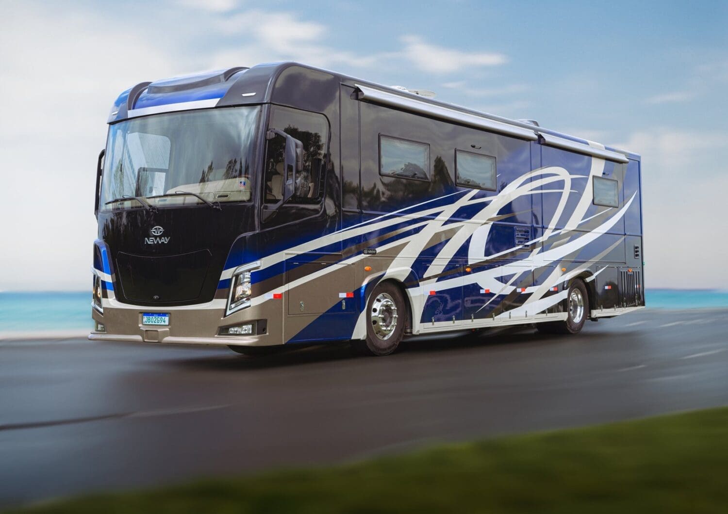 Montado com cabine exclusiva projetada pela Neway sobre a plataforma dos chassis de ônibus Volvo B510R ou Scania K320/K370 (10,5m a 12,0m comprimento), o Neway LEGACY, acomoda 08 pessoas confortavelmente.